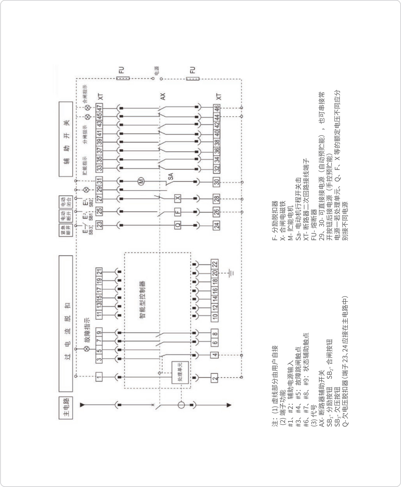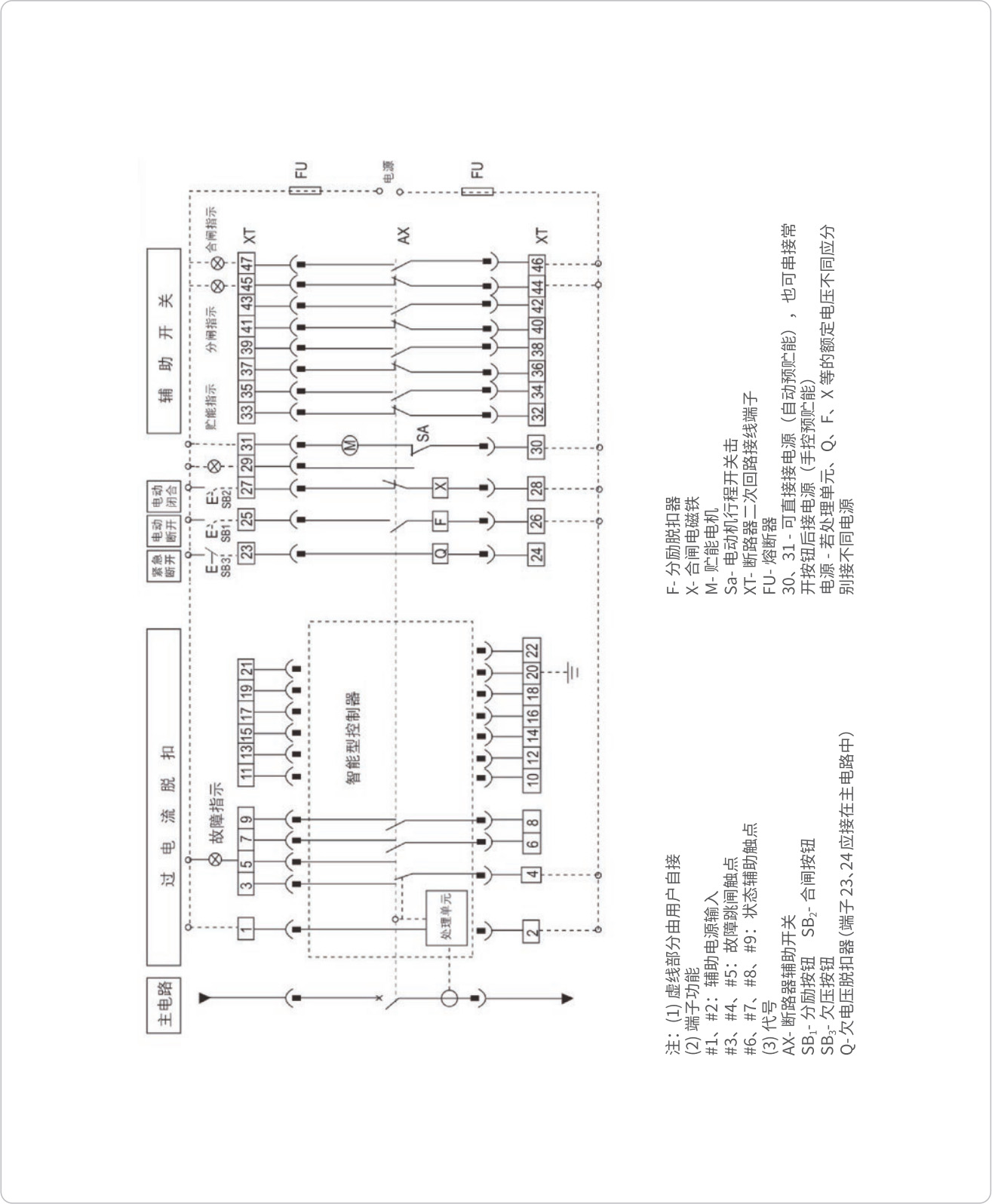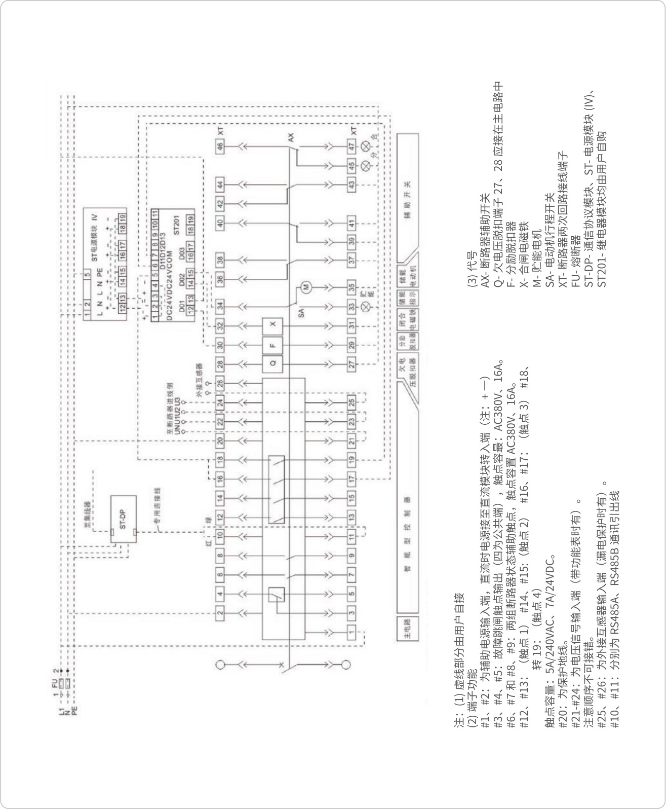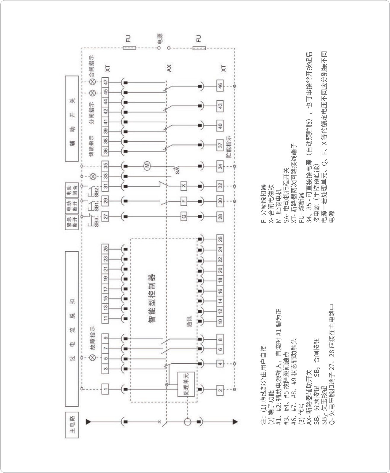 ?◇ 配 2M、2H 智能控制器的斷路器二次回路接線圖(輔助開關(guān)由四組轉(zhuǎn)換觸頭組成)