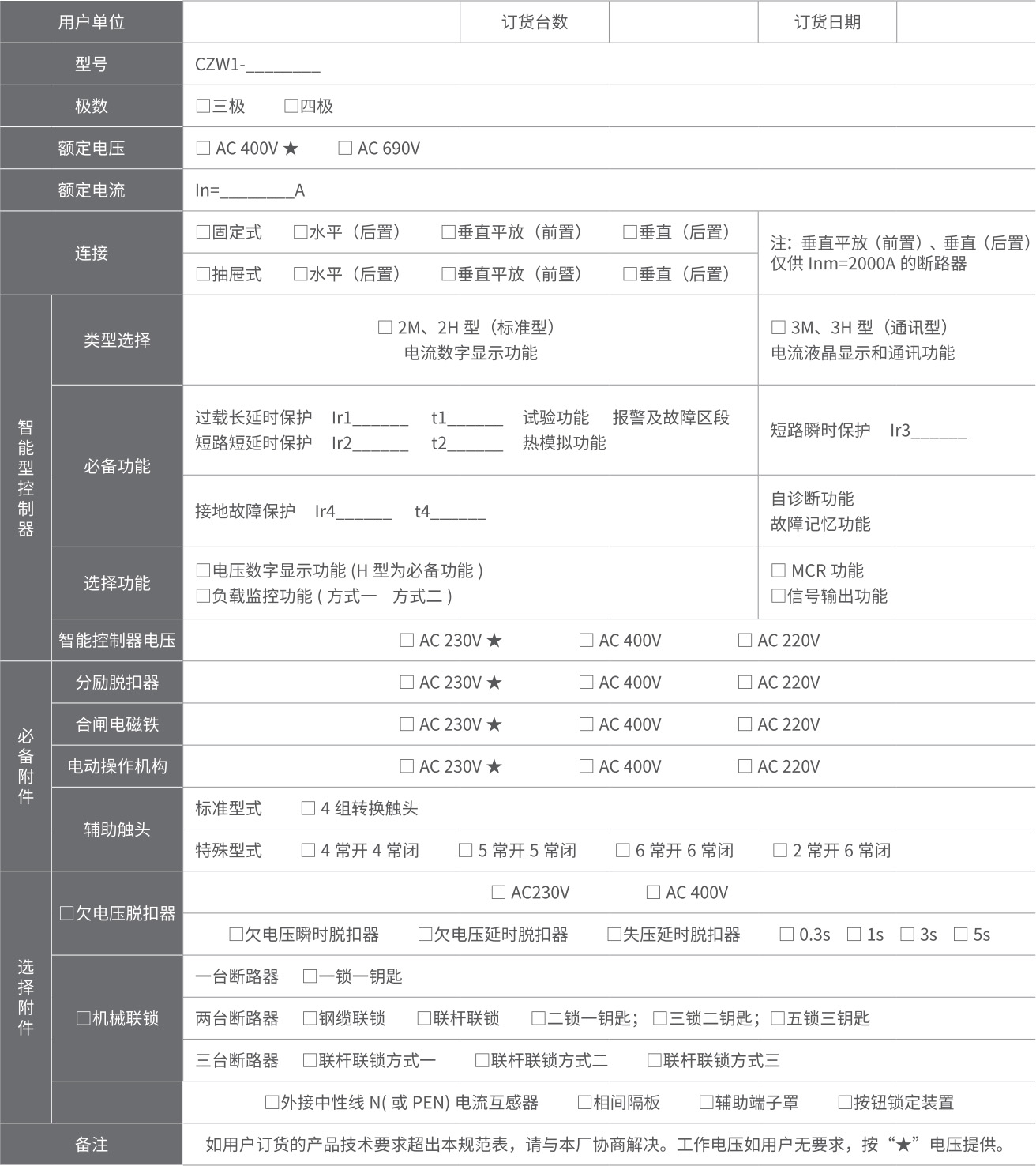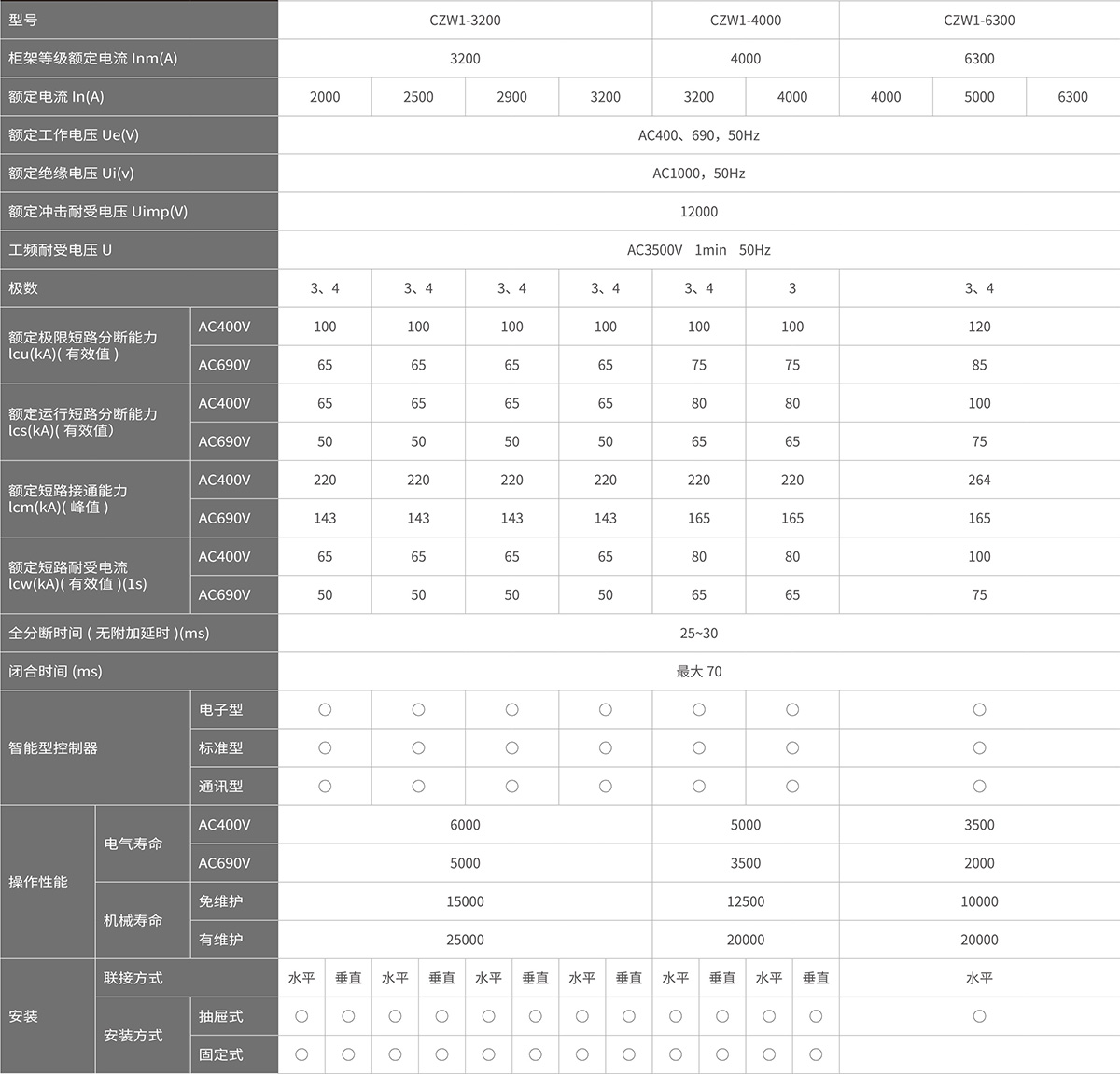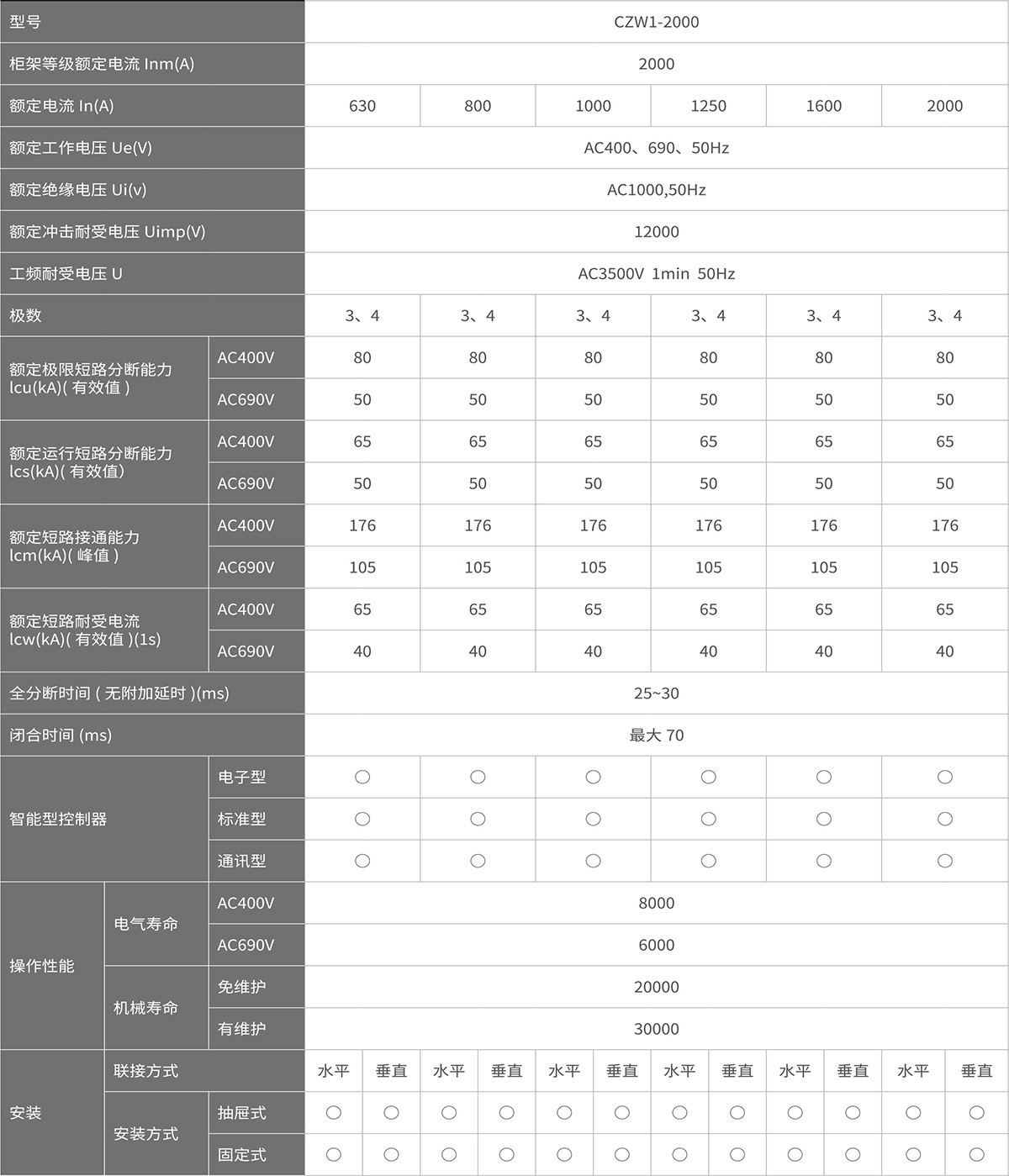 CZW1 系列智能型萬能式斷路器用于控制和保護低壓配電網(wǎng)絡(luò)。一般安裝在低壓配電柜中做主開關(guān)起總保護作用。其技術(shù)性能已達到了當代國際上同類型產(chǎn)品先進水平。 1、交流額定電流 630A-6300A; 2、短路分斷能力 80kA-120kA( 有效值 ); 3、額定工作電壓 AC690V 及以下; 4、具有 3 極和 4 極: 5、抽屜式和固定式; 6、可倒進線安裝; 7、多種智能控制器,提供不同功能; 8、執(zhí)行 IEC60947-2、GB/T14048.2 的標準。型號及其含義