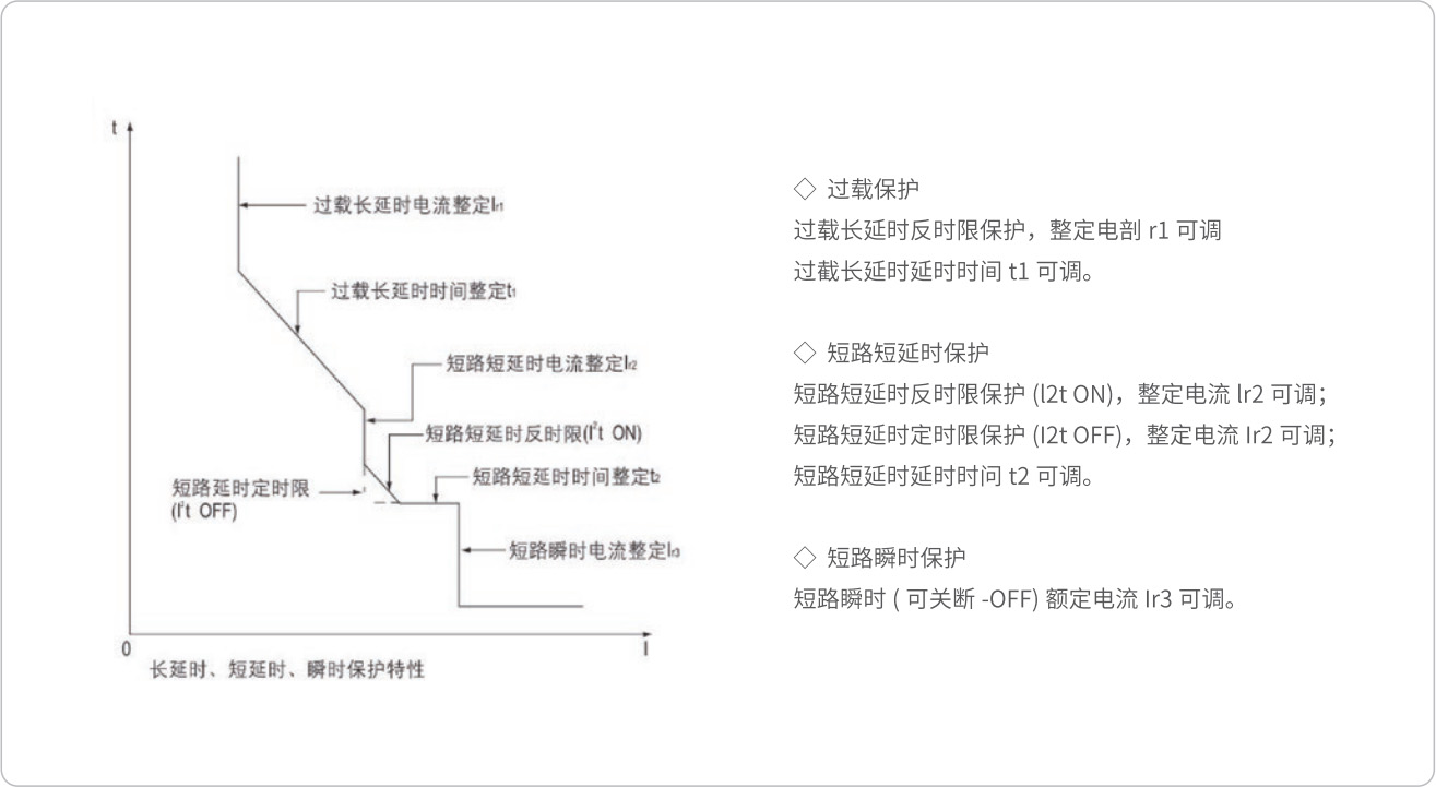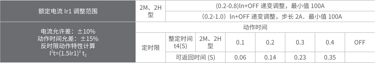 在低倍數(shù)電流時為反時限特性:當過載電流大于 8lr1 時自動轉(zhuǎn)換為定時限特性。短延時 l2t 特性可“OFF”.此時呈定時限特性。