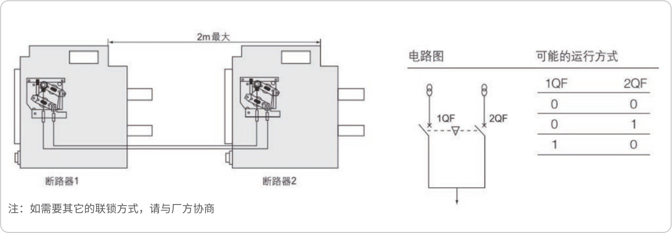 ?◇ 兩臺平放抽屜式斷路器的鋼纜聯(lián)鎖或兩臺疊裝抽屜式斷路器的聯(lián)桿聯(lián)鎖